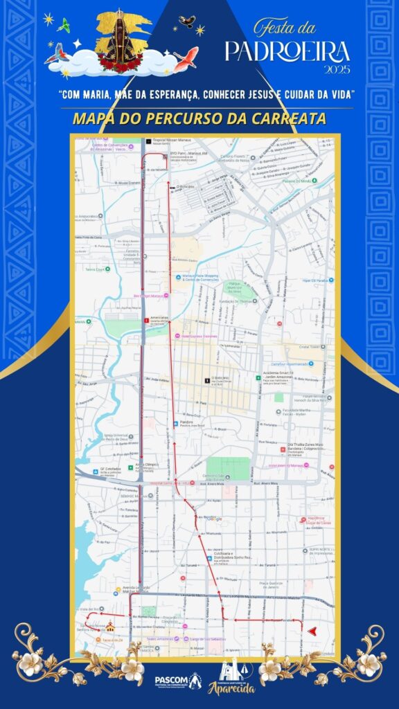 “Com Maria, Mãe da esperança, conhecer Jesus e cuidar da vida” é o tema da Festa da Padroeira 2025 em Manaus. A programação será realizada entre os dias 2 e 12 de outubro na Paróquia Santuário Nossa Senhora da Imaculada Conceição Aparecida, localizada na rua Alexandre Amorim, bairro Aparecida, zona Sul da capital.